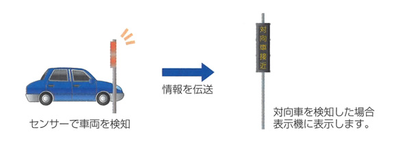 区間前後に表示機と車両センサーが設置されており、車両センサーで車両の進入有無と車両の大きさを同時に検出。検出された情報は対向側の表示機へ送信され、「対向車接近」または「大型車接近」を表示します。進入した車両が対向側の車両センサーを通過すると表示が消灯します。進入車輛の台数もカウントしており、複数台の車両が通過してもカウントした台数分が対向側の車両センサーを通過しないと表示は消えない仕様になっています。