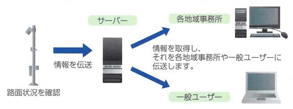 「走行支援システム」は、安全で快適な交通を確立するために、橋梁の強風警報、路面冠水検知、対向車接近検知、さまざまな道路環境の危険因子をリアルタイムで把握する観測・警報装置群とソフトウェアを統合したシステムです。