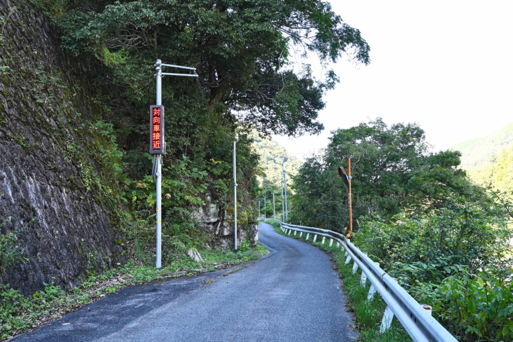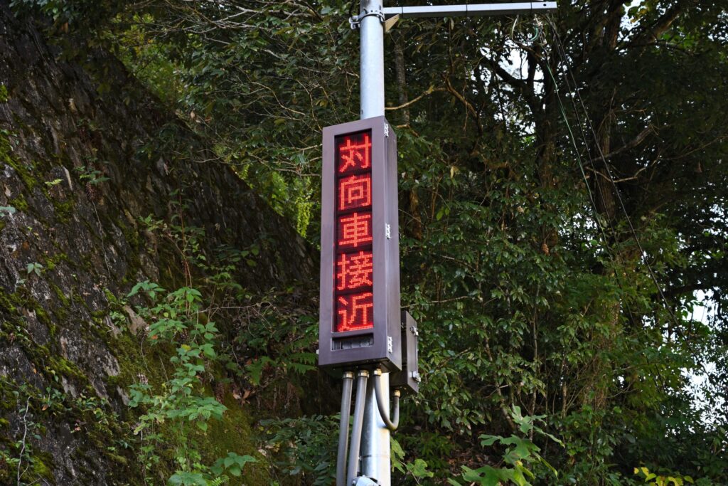 見通しが悪く離合困難な路線区間の前後に設置し、区間進入前に前方から対向車が来ていることをドライバーに表示で知らせるシステムです。